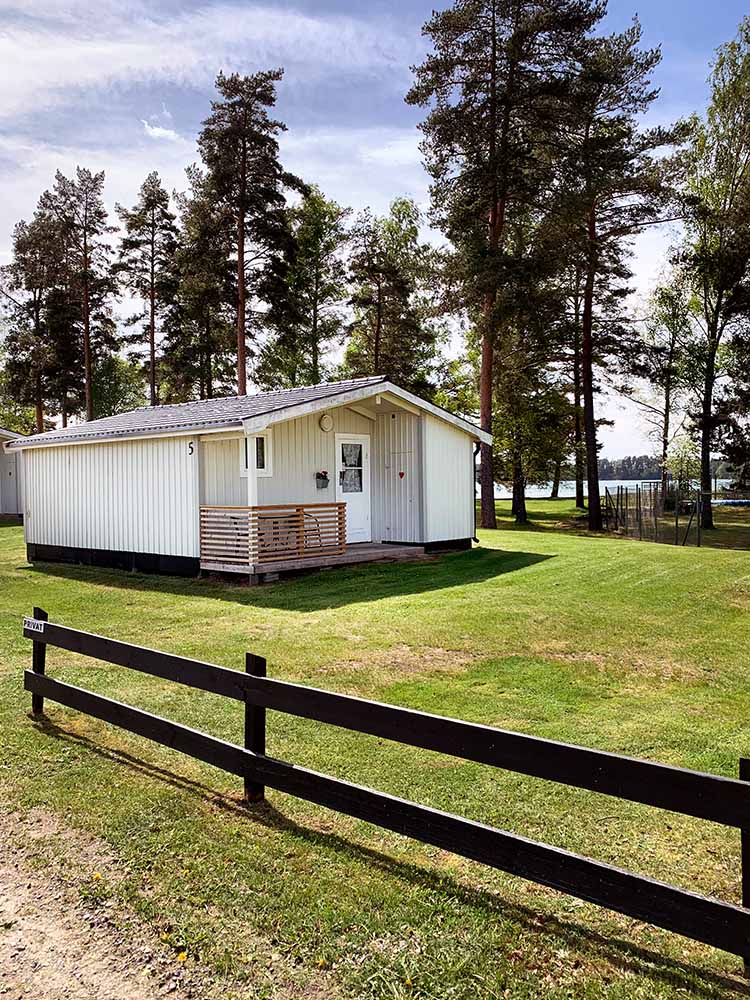 Stugorna har ett härligt läge vid Hargebadens sandstrand och bjuder på en fantastisk utsikt över Vättern.